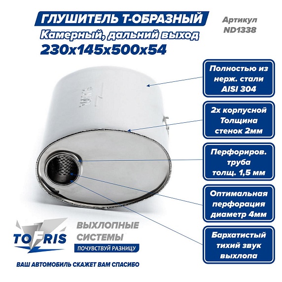 Внутренний узел глушителя выполнен по лабиринтно-камерной схеме, с гильзой на входе и 2-мя стронгерами на выходе, что обеспечивает бархатистую тихую работу выхлопа.