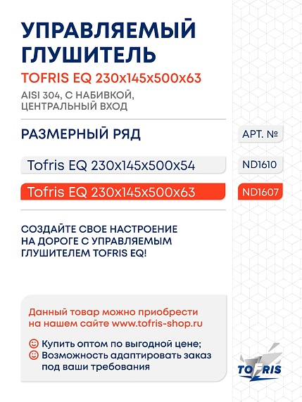 С Управляемый глушитель Т-образный Tofris EQ 230*145*500*54, AISI 304, с набивкой, центральный вход Вы одновременно получите комфортную и максимально производительную выпускную систему для своего автомобиля. Изделие универсальное и имеет один вход и два выхода с установленными на них электрическими заслонками. Внутренняя конструкция данного глушителя разработана специально для размещения двух трактов выхода выхлопных газов, первый тракт - громкий (прямоток) для максимальной производительности, второй тракт- тихий (лабиринтно- секционный) звук под сток (городской режим). В комплект поставки Т-образного управляемого глушителя входят два ограничителя выхлопа (электрические заслонки). В результате установки глушителя с заслонками: в закрытом состоянии заслонок мы получаем стандартную для городского использования пропускную способность и звук, а в открытом состоянии двигатель раскрывает полную мощь звука, проявляются низкие приятные частоты, басистое звучание. Используемая набивка в глушителях обладает высокими долговечными эксплуатационными характеристиками: негорючая, стойкая к влиянию пара, воды и масла, слабой теплопроводностью, высокой температурной стабильностью, температура плавления не менее 1200 градусов, а также высокий коэффициент шумоподавления.