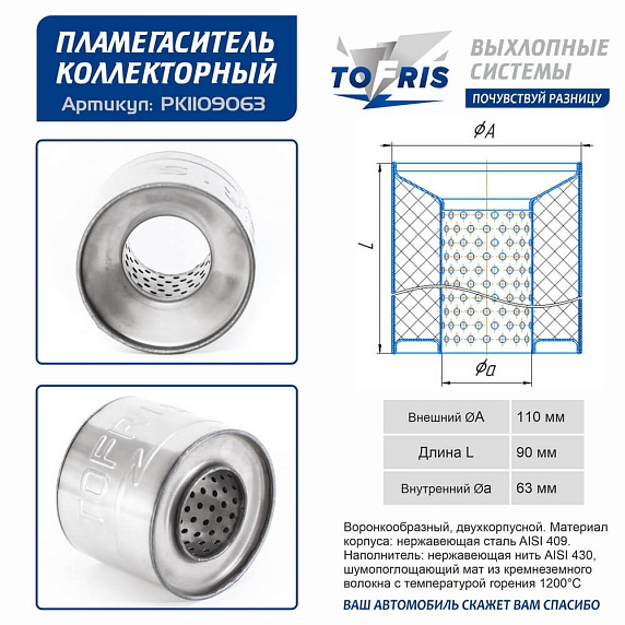 Пламегаситель универсальный 110*90*63 воронкообразный с набивкой и усиленной конструкцией – ключевой элемент для продления срока службы глушителя и резонатора. Изготовленный из жаростойкой нержавеющей стали AISI 409 с двойным корпусом (2 мм), он эффективно гасит пламя, снижает вибрации и защищает дорогостоящие компоненты выхлопа от прогорания. Идеален для замены штатных «банок» или интеграции в тюнинговые системы.