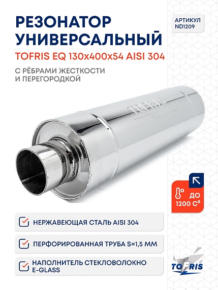 Резонатор универсальный Tofris EQ 130*400*54 с р/ж и перегородкой, AISI 304 - отличный выбор для тех, кто ценит качество, надежность и тишину в своем автомобиле!