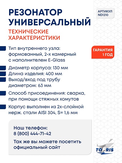 Резонатор универсальный Tofris EQ 130*400*63 с р/ж и перегородкой, AISI 304