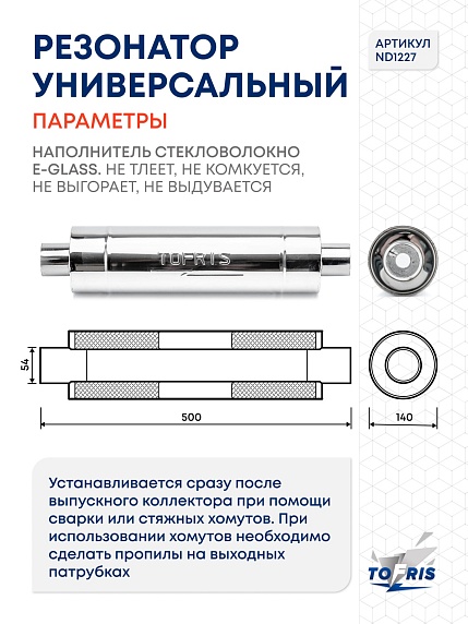 Резонатор универсальный Tofris EQ 140*500*54 с р/ж и перегородкой, AISI 304 - отличный выбор для тех, кто ценит качество, надежность и тишину в своем автомобиле!